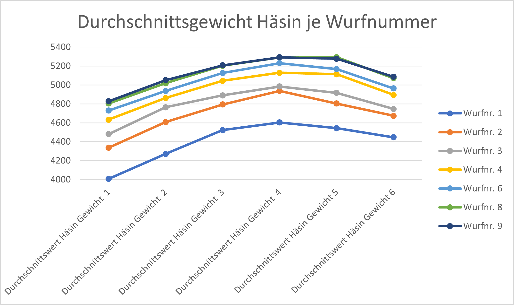 Eine optimale Gewichtsentwicklung einer Häsin ist von größter Bedeutung. Bei einer ordnungsgemäßen Gewichtsentwicklung ist die Häsin in der Lage, gesunde, große und vitale Würfe zu gebären und großzuziehen. Zugleich trägt die Gewichtsentwicklung zur Lebensdauer der Häsin bei. Während jeder Tracht sollte eine Häsin wachsen können. Dieses Wachstum besteht darin, das ihr Körper und ihre Embryos sich ordnungsgemäß entwickeln und ihr Regenerationswachstum in Ordnung ist. Für die Zuchthäsinnen kommt dann noch die eigene (rasche) Entwicklung hinzu. Eine optimale Kondition und deren Erhalt ist somit von entscheidender Bedeutung. Aber wie sieht die Gewichtsentwicklung einer Häsin nun tatsächlich aus?