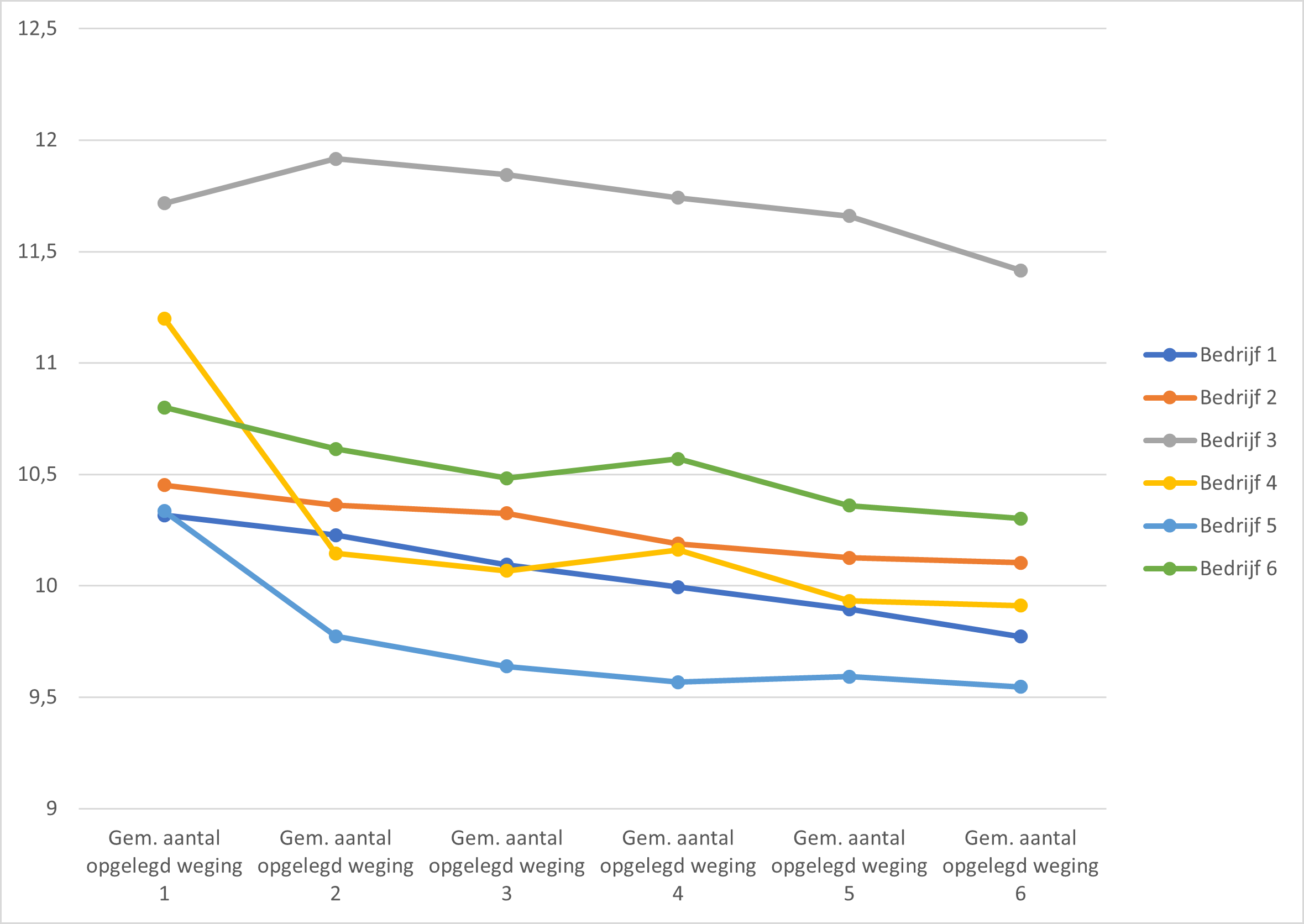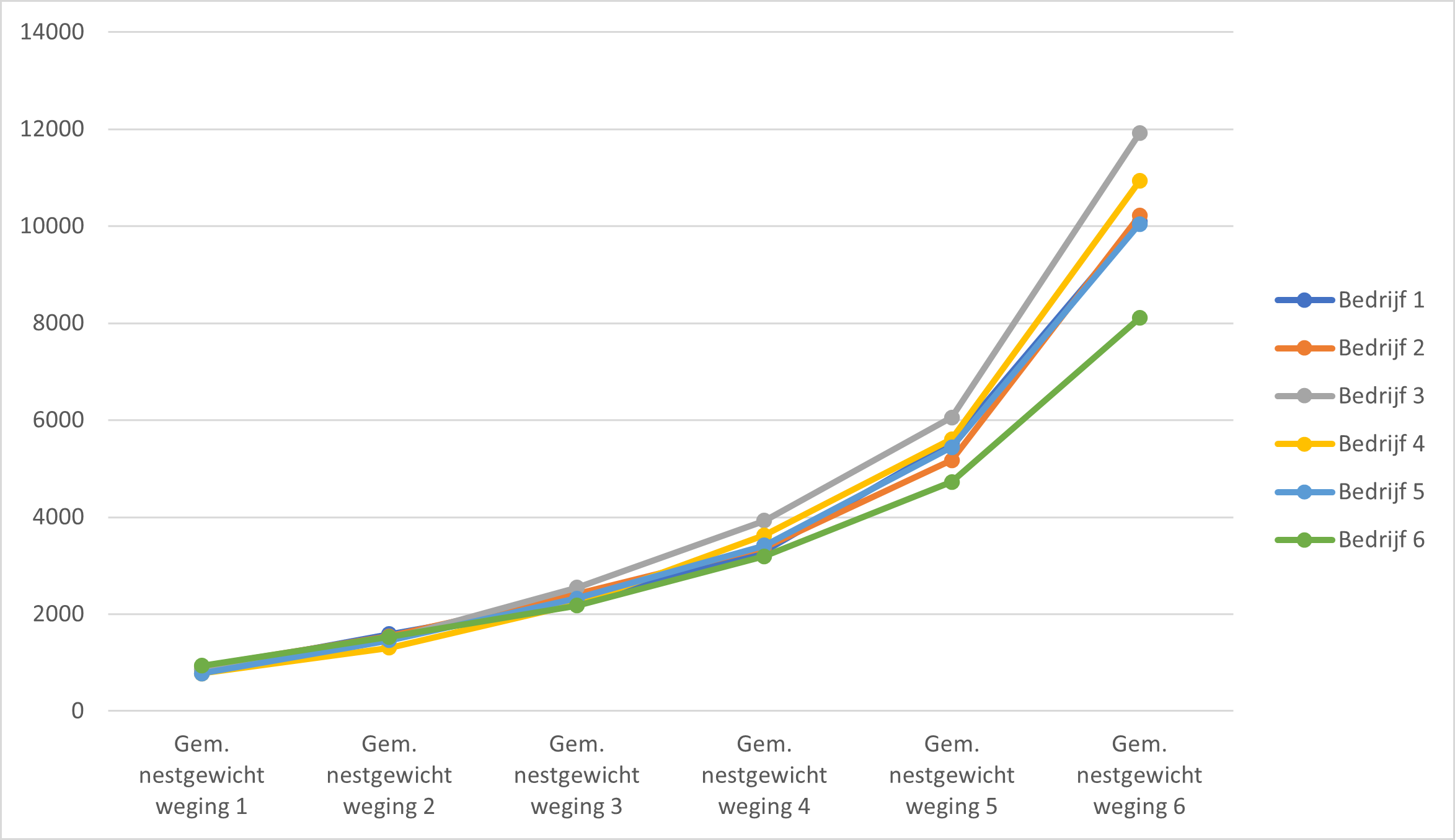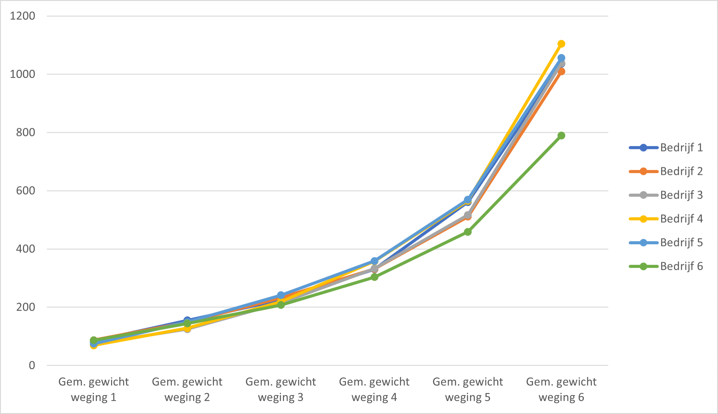 Das Gewicht der Jungkaninchen wurde während der Laufzeit des Versuchs 6 Mal gemessen. Am 2., 6., 11., 21., 25. und 36. Tag wurden Wägungen vorgenommen. Die Jungkaninchen wurden dabei als Nest und separat gewogen. Bei der ersten Wägung am 2. Tag variieren die Gewichte pro Jungkaninchen zwischen 69 Gramm und 87 Gramm mit einem Durchschnittswert von 79 Gramm für die 6 Betriebe insgesamt. Die Endgewichte am 36. Tag variieren zwischen 790 Gramm und 1105 Gramm mit einem Durchschnittswert von 1026 Gramm für die Betriebe insgesamt. Auf der ganzen Linie lässt sich in Sachen Gewichtsentwicklung ein ähnlicher Trend beobachten (siehe Abbildung 3).