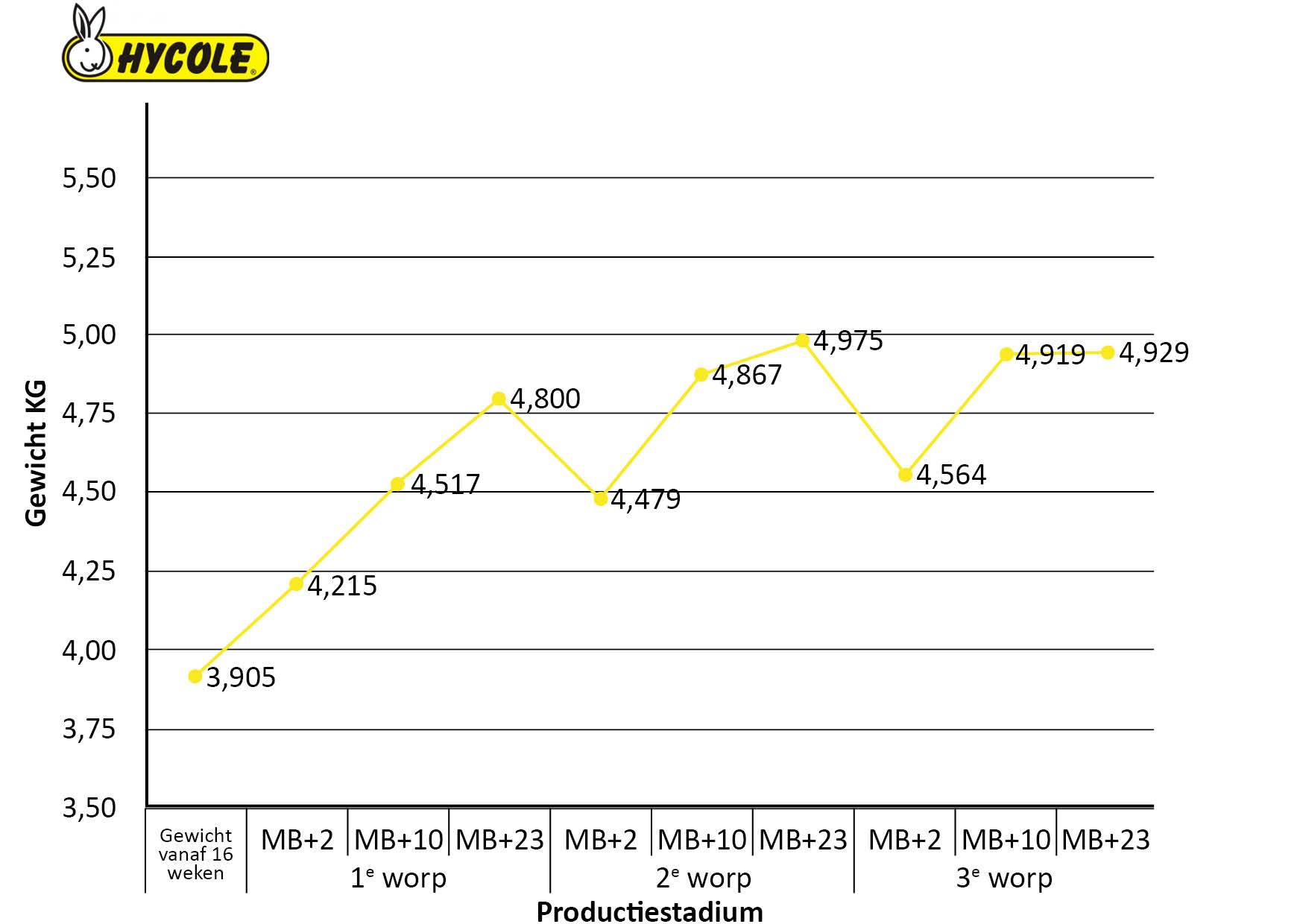 Victoria hat in den vergangenen Jahren auf verschiedenerlei Praxisbetrieben Wägungen bei den Häsinnen durchgeführt. Auch während der Aufzuchtperiode wurden die Gewichte erfasst. Anschließend sind die Gewichte der individuellen Häsinnen mit den erzielten technischen Ergebnissen angesichts der darauffolgenden Würfe miteinander verlinkt. Unsere Schlussfolgerung ist deshalb, dass ein gesundes Startgewicht der Häsin anzustreben ist. Dabei kann die Richtlinie befolgt werden, die von der Zuchtorganisation erteilt worden ist. Im Klartext: Wenn die Häsinnen bei der 1. Insemination zu leicht oder zu schwer im Gewicht sind, produzieren sie weniger Absetzkaninchen in den darauffolgenden Würfen.