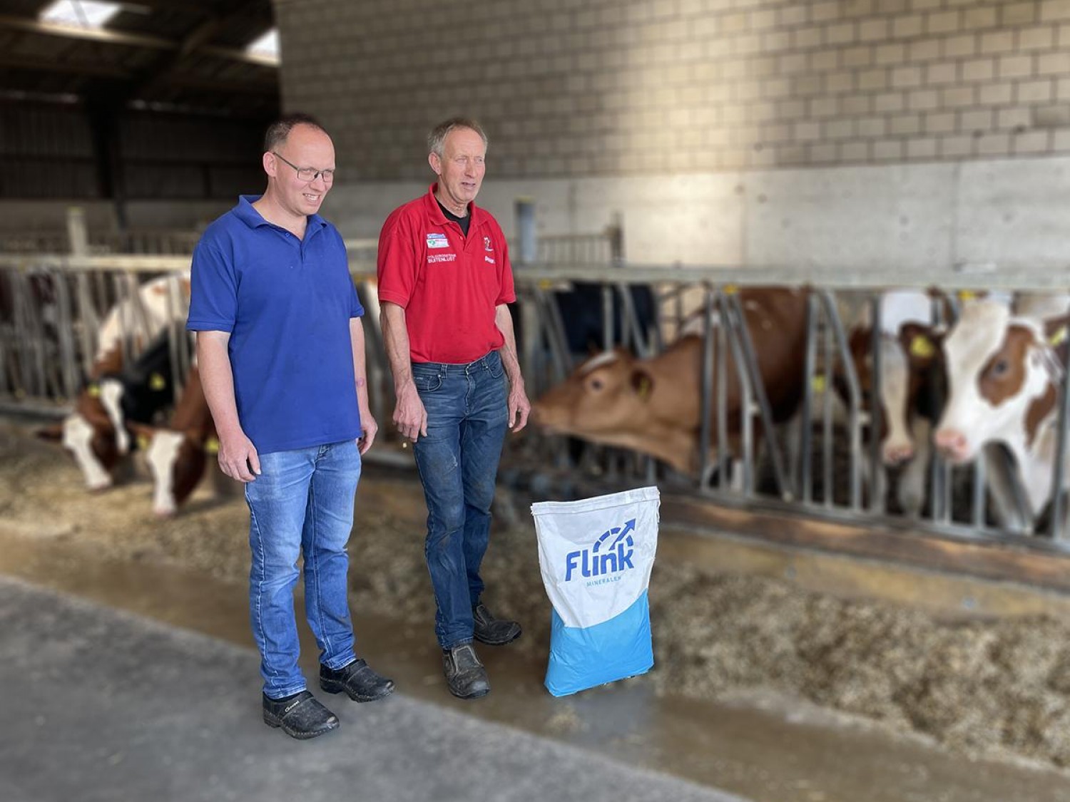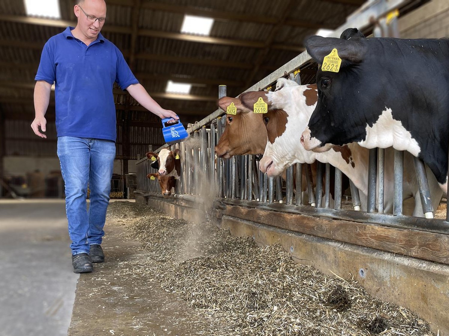 Jan en Teun voeren het oudere jongvee een specifiek jongveemineralenmengsel van van Flink. Dit is een mengsel in granulaatvorm, dat precies die componenten bevat die het jongvee op het bedrijf nodig heeft. Het mengsel wordt met de hand over het voer gestrooid. “Dit alles-in-een-mengsel werkt gemakkelijk. Je weet dat je naar behoefte voert. We hoeven niet met vijf verschillende zakken poeder te werken om toch precies te geven wat een dier nodig heeft. Dat doen we bij het melkvee ook niet. Ook daar voeren we een mineralenmengsel dat vanuit de crush-silo in de mengwagen meegaat”, vertelt Jan. Door het gewicht van het granulaat waait het niet weg. Het blijft mooi aan het voer plakken, waardoor het niet op de grond terecht komt of wegstuitert.” In de zomer gaan de pinken van Jan en Teun een paar maanden de wei in. Dan is mineralen bijvoeren niet mogelijk. “Dan krijgen de dieren twee bolussen in. Zeker ook omdat ze dan na twee maanden naar het natuurgebied gaan. Dan is extra aanvulling zeker nodig.”